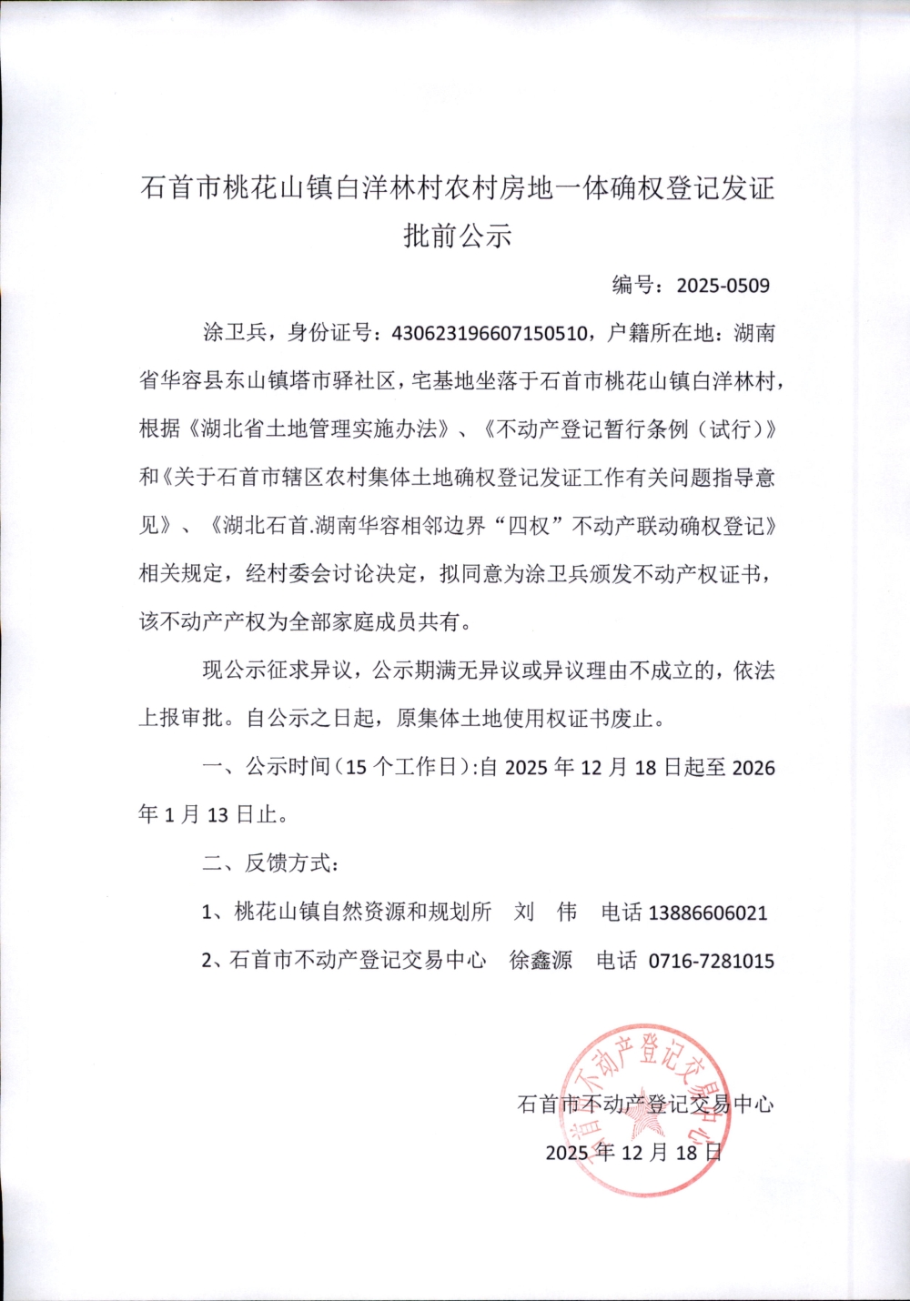 石首市桃花山镇白洋林村农村房地一体确权登记发证(涂卫兵)