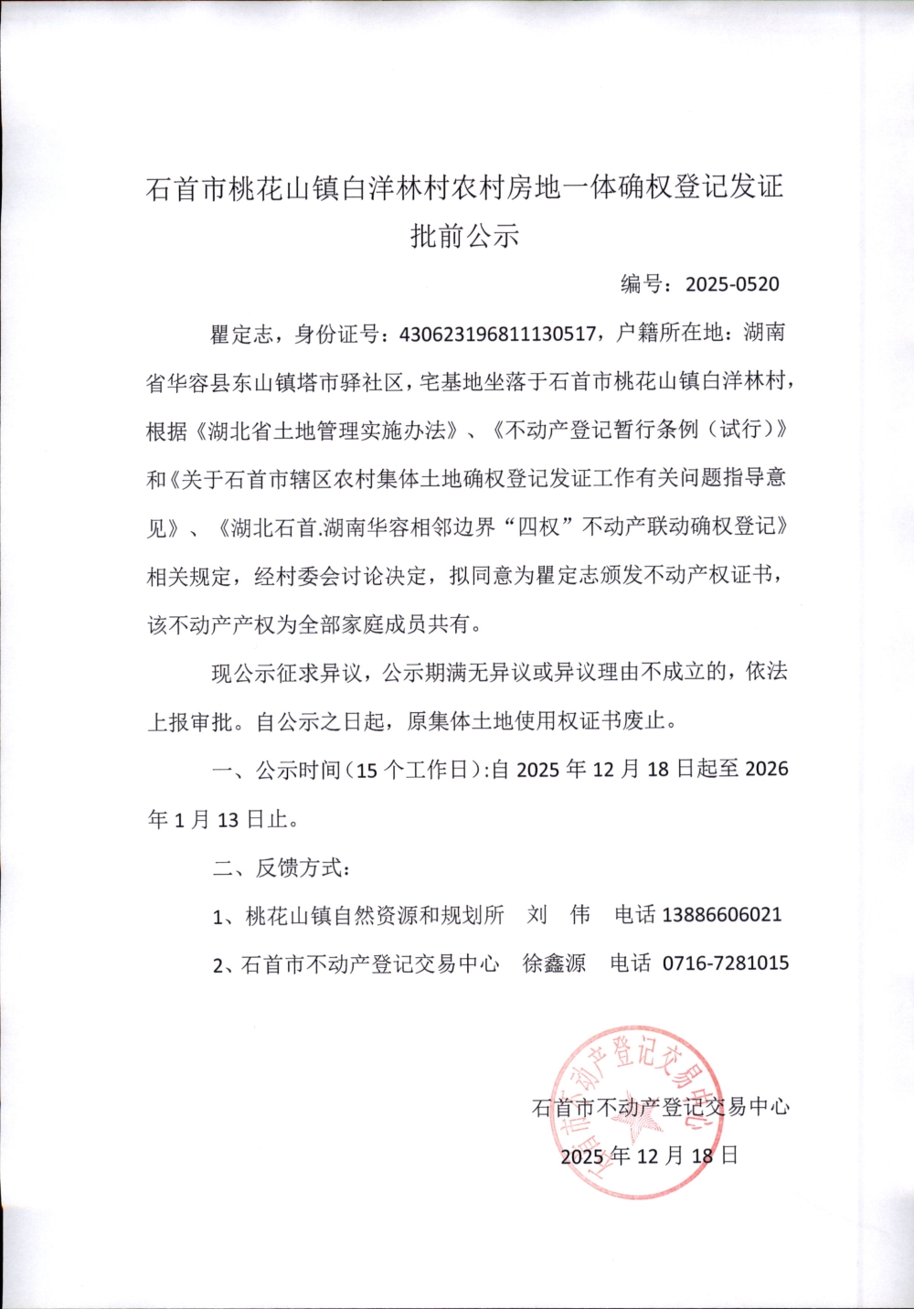 石首市桃花山镇白洋林村农村房地一体确权登记发证(瞿定志)