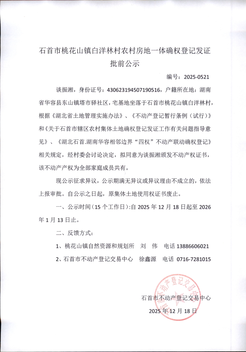 石首市桃花山镇白洋林村农村房地一体确权登记发证(谈振湘)