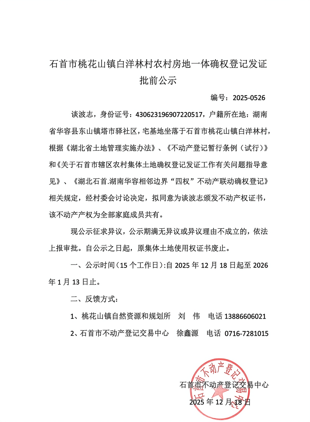 石首市桃花山镇白洋林村农村房地一体确权登记发证(谈波志)