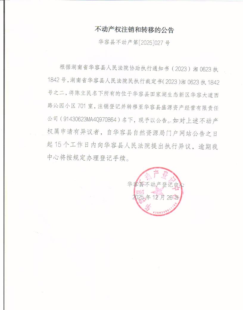 不动产权证注销和转移的公告(陈立民转华容盛源资产经营有限责任公司)