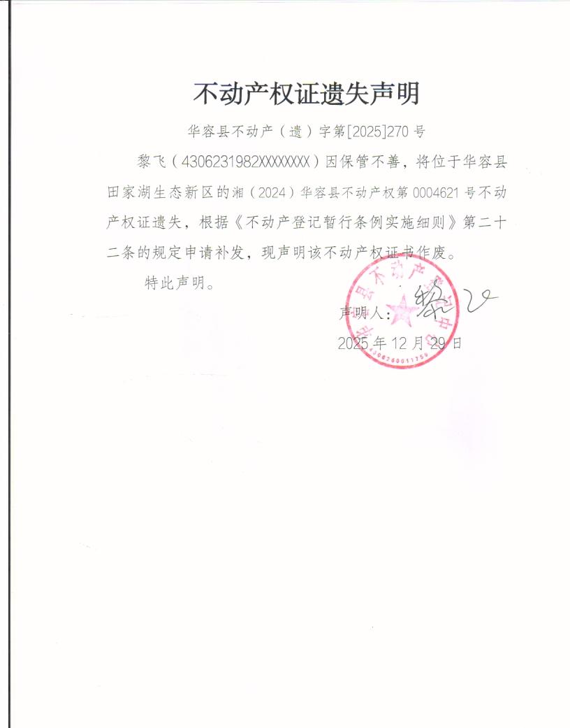 不动产权证遗失声明(黎飞)