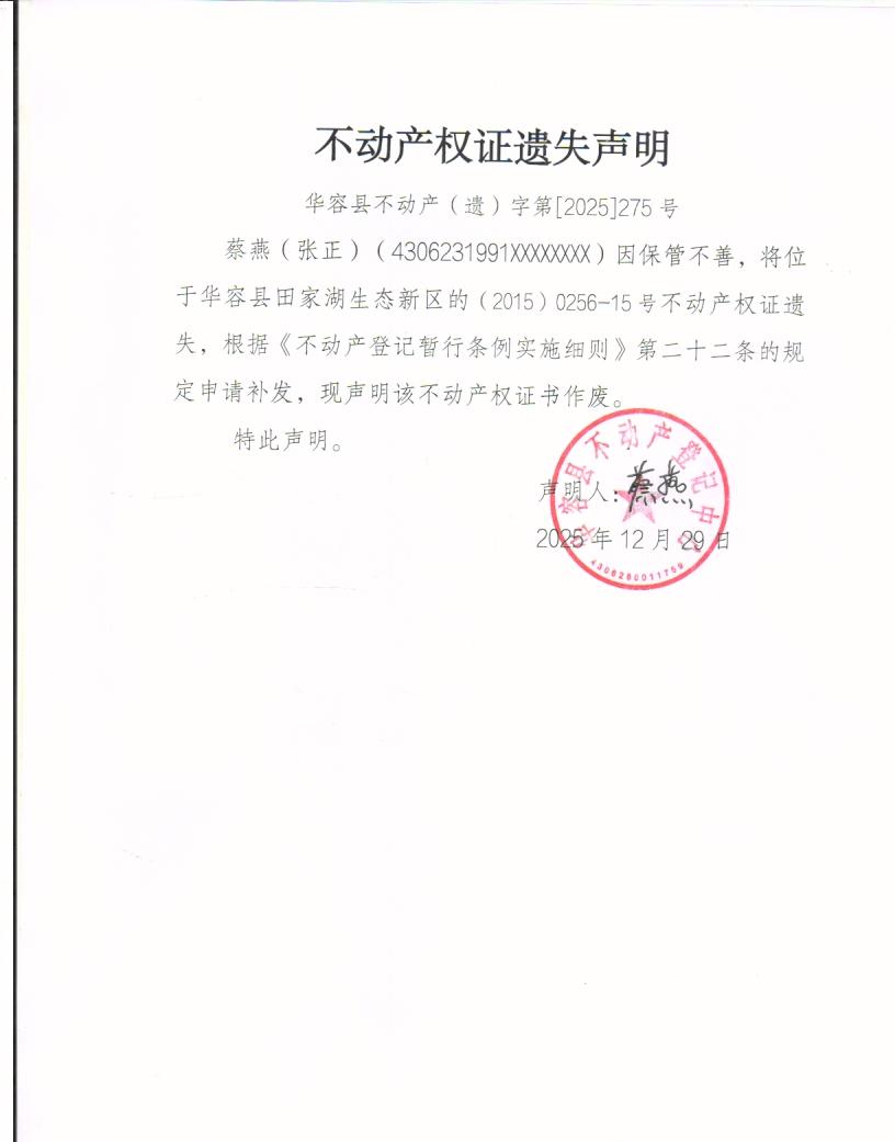 不动产权证遗失声明(蔡燕)