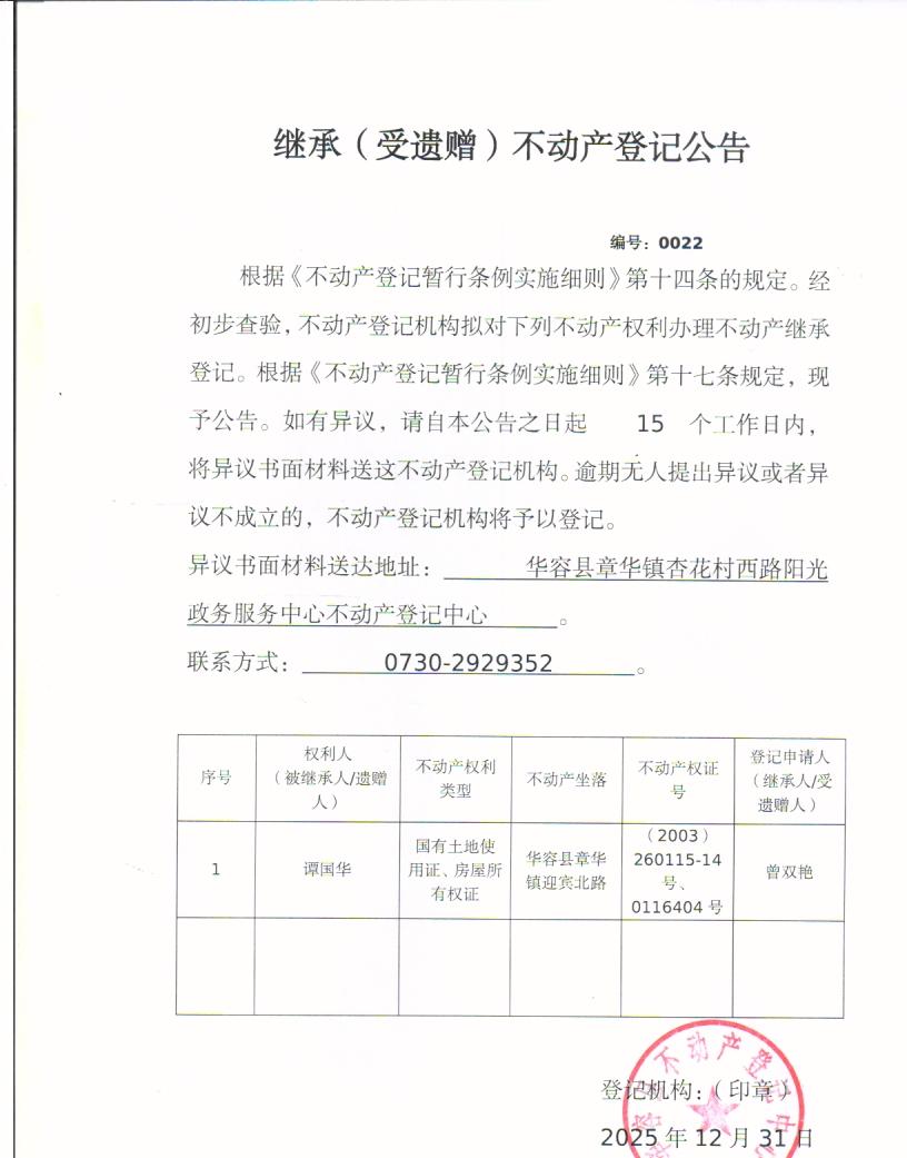 继承(受遗赠)不动产登记公告(谭国华转曾双艳)