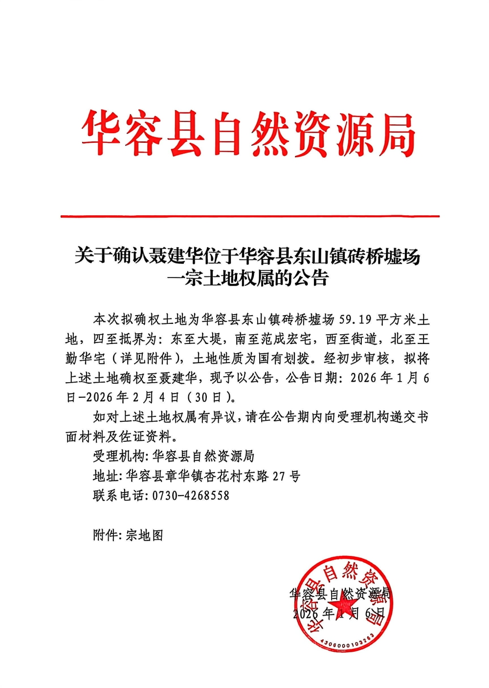 关于确认聂建华位于华容县东山镇砖桥墟场一宗土地权属的公告