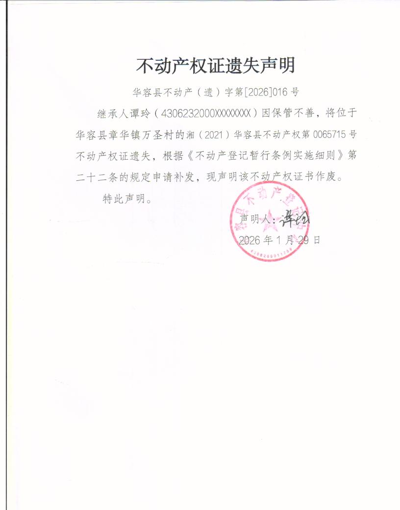 不动产权证遗失声明(谭玲)