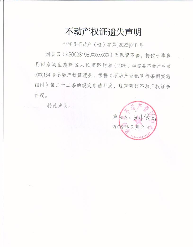 不动产权证遗失声明(刘会云)