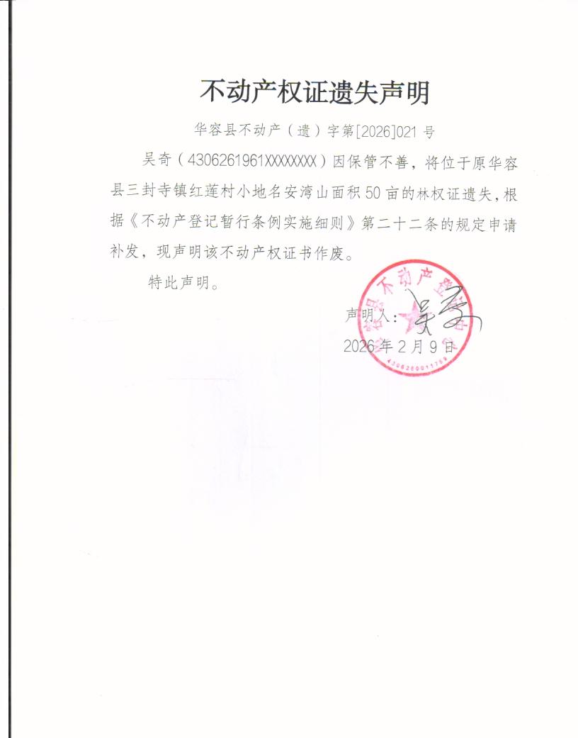不动产权证遗失声明(吴奇)