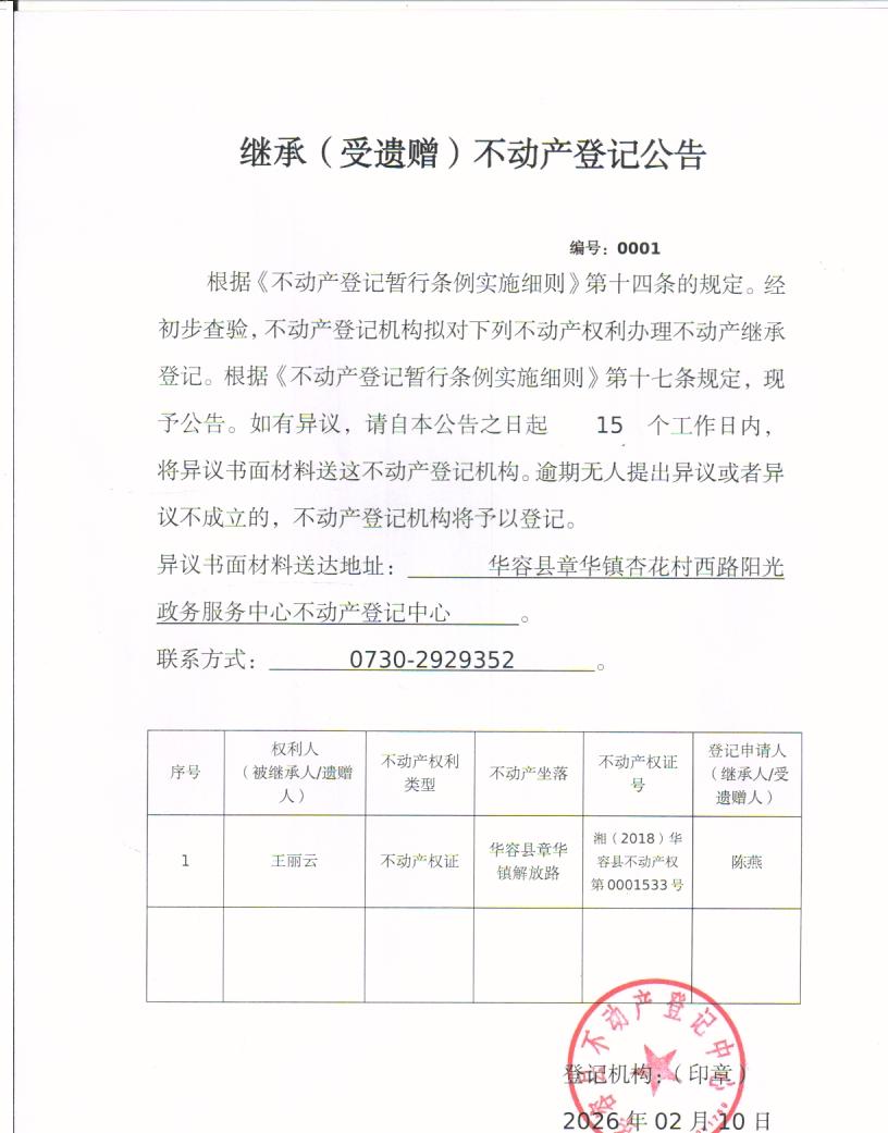 继承(受遗赠)不动产登记公告(王丽云转陈燕)