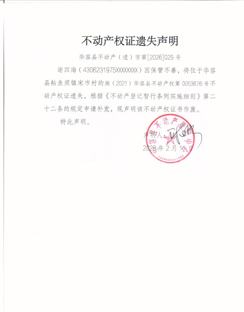 不动产权证遗失声明(谢四海)