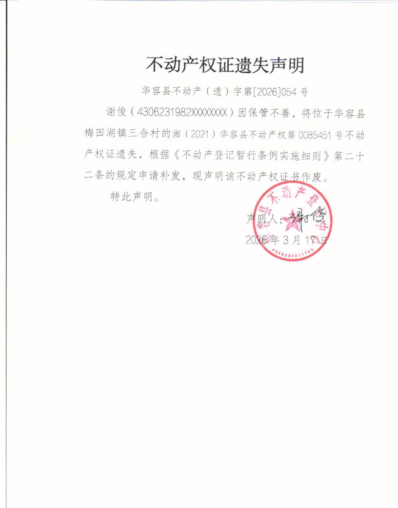 不动产权证遗失声明(谢俊)
