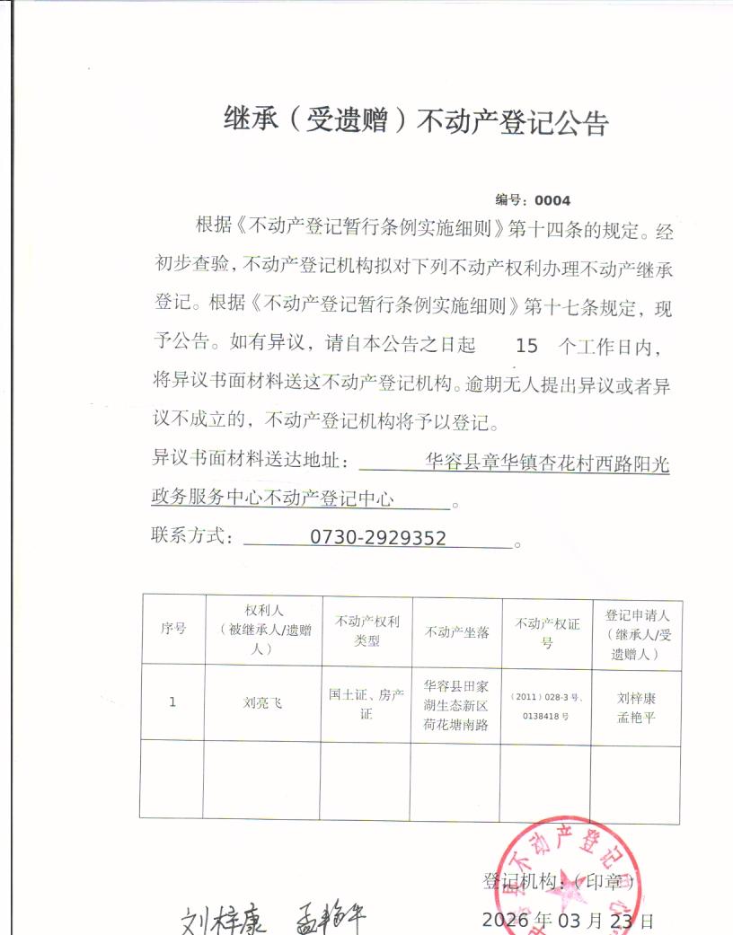 继承(受遗赠)不动产登记公告(刘亮飞转刘梓康 孟艳平)