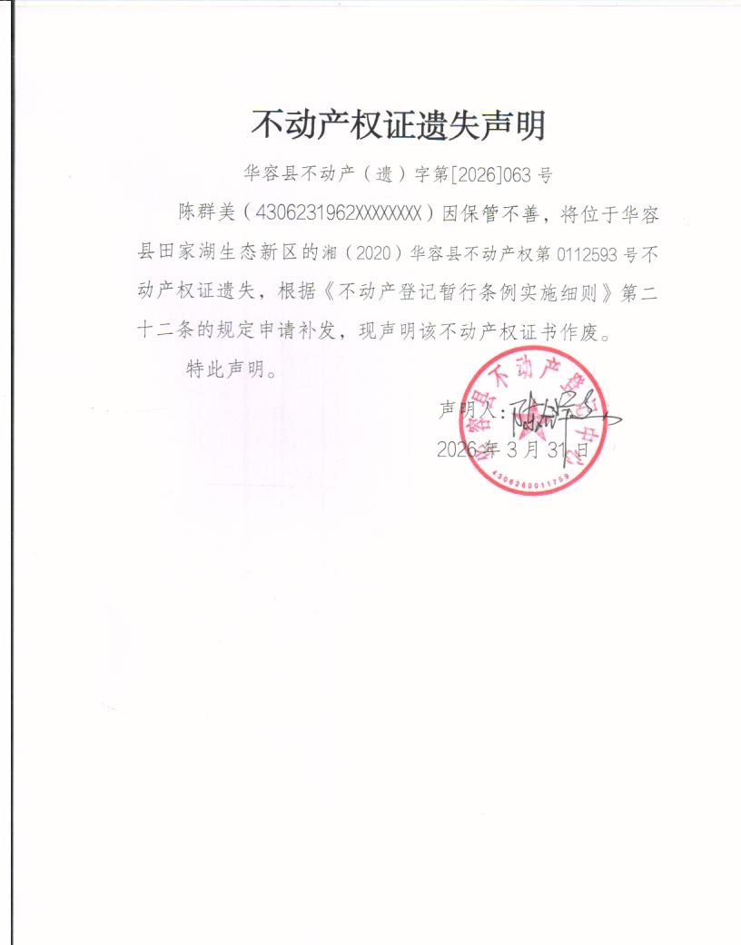 不动产权证遗失声明(陈群美)