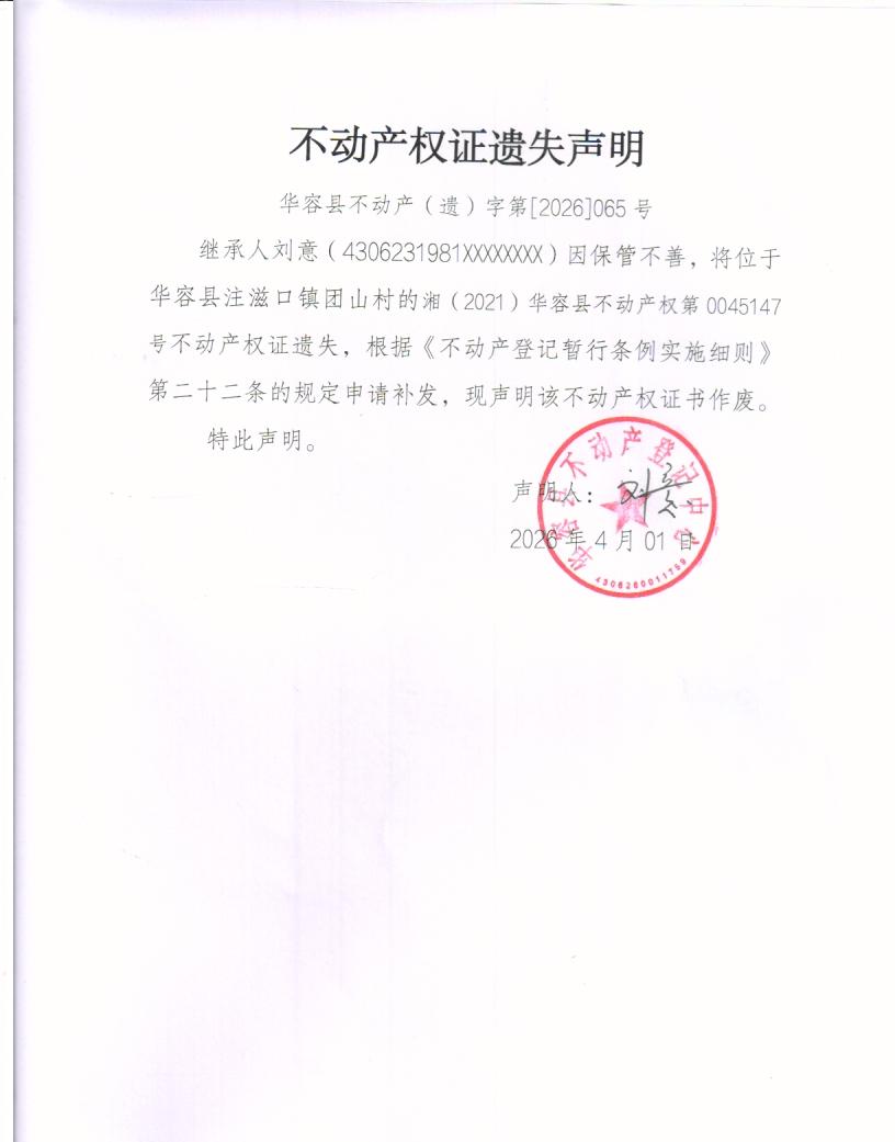 不动产权证遗失声明(刘意)