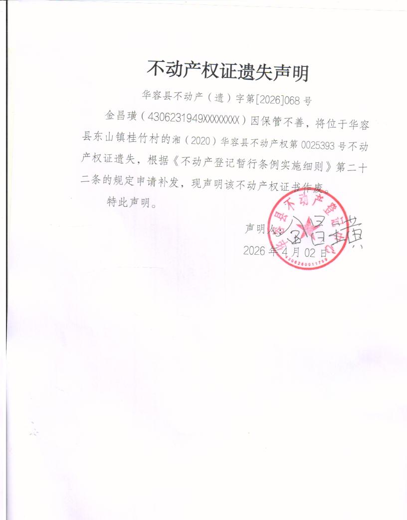 不动产权证遗失声明(金昌璜)