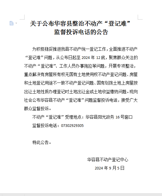 关于公布华容县整治不动产“登记难”监督投诉电话的公告