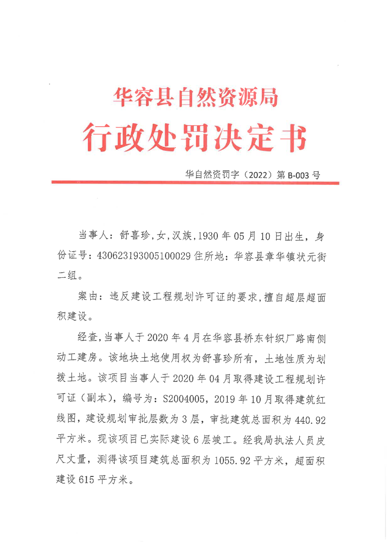 华自然资罚字(2022)第B-003号 舒喜珍违法建设案