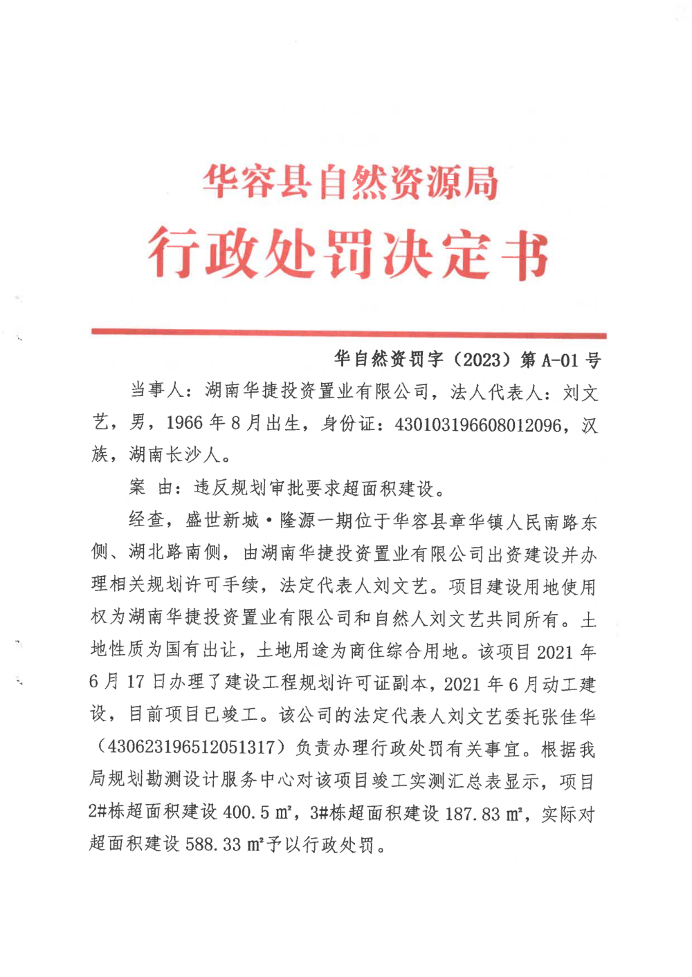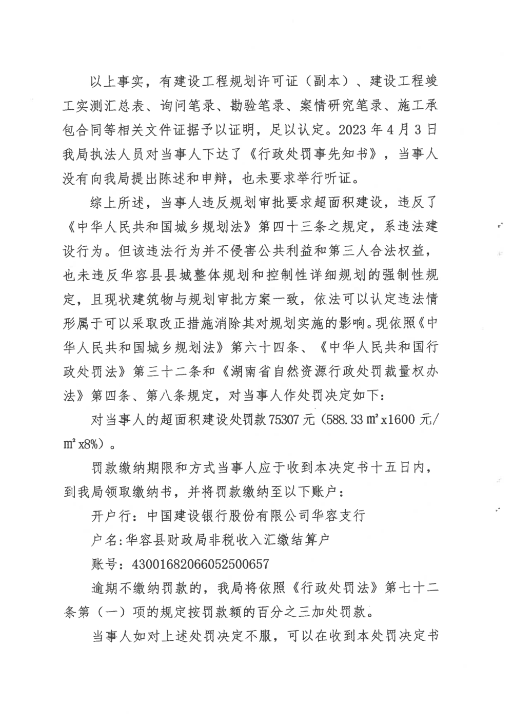 华自然资罚字(2023)第A-01号 刘文艺违反规划审批要求超面积建设案