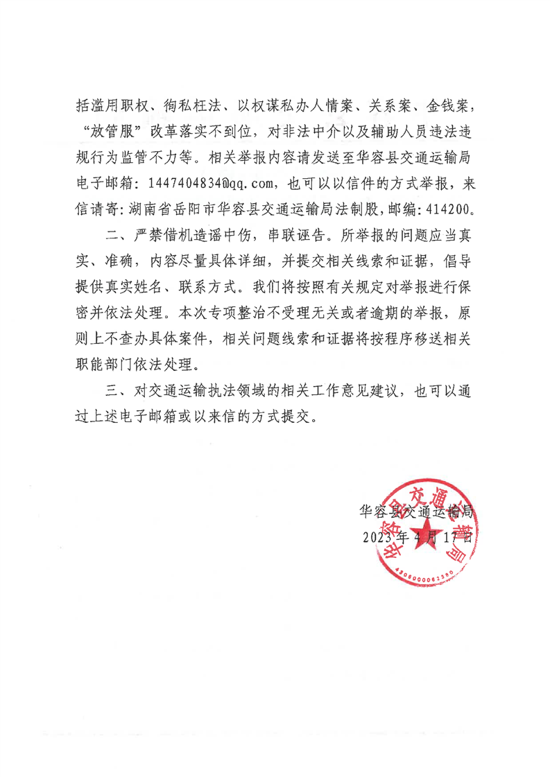 华容县交通运输局 关于受理反映交通运输执法领域突出问题举报的公告