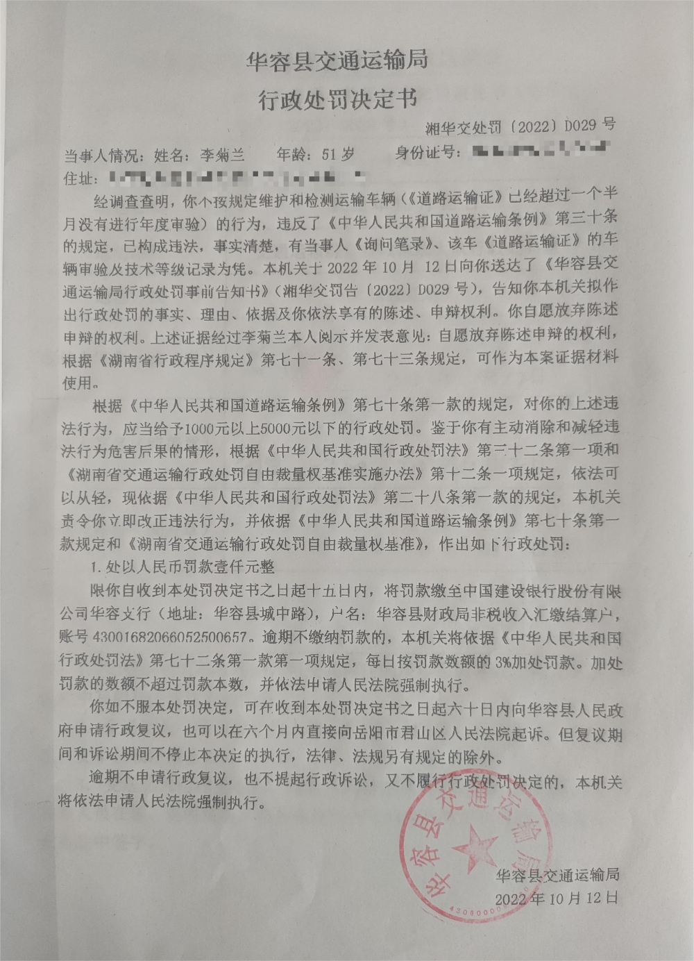李菊兰不按规定维护和检测运输车辆的行政处罚公示(湘华交处罚[2022]D029号)