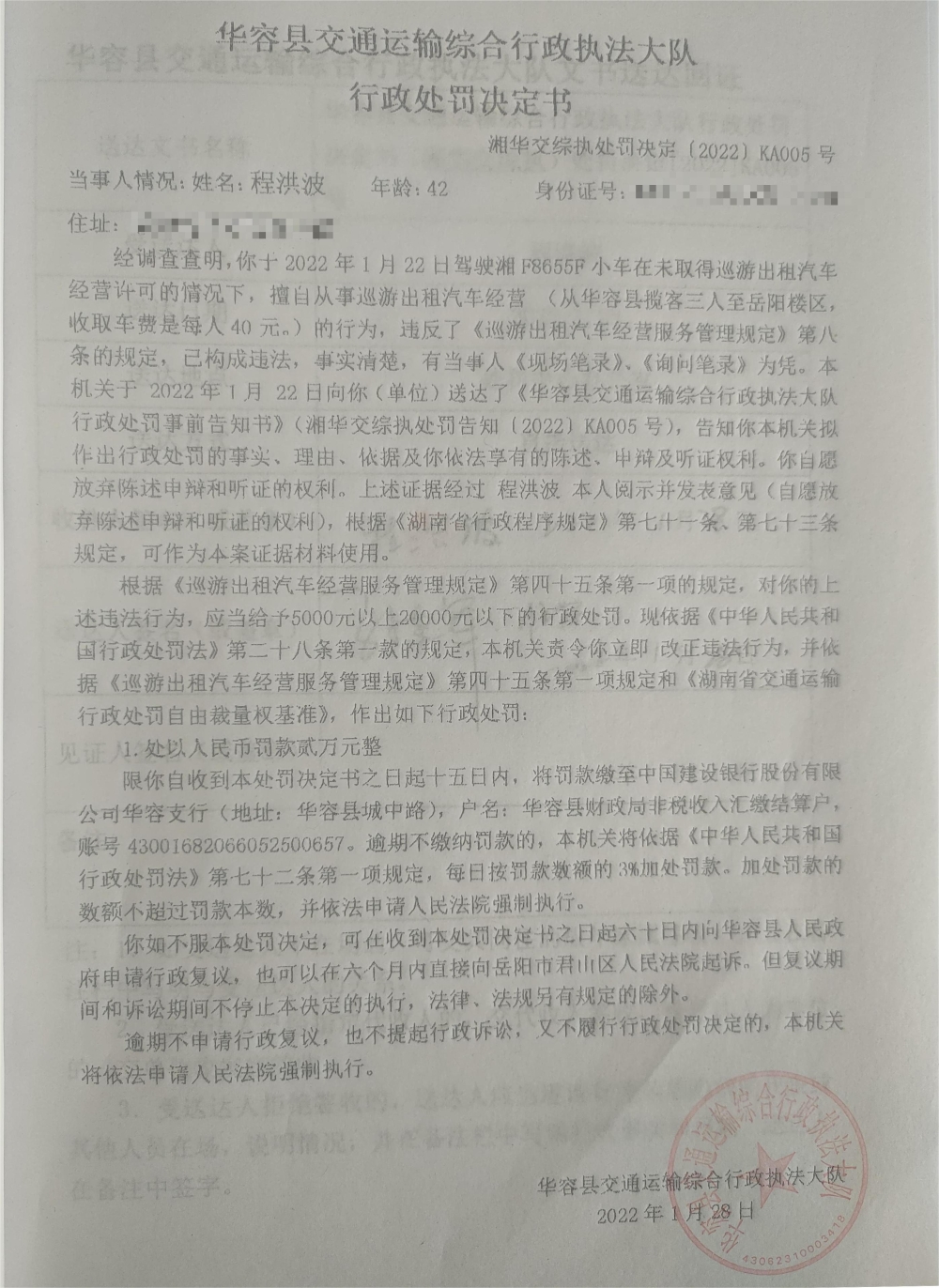 程洪波擅自从事巡游出租汽车经营的行政处罚公示(湘华交综执处罚决定[2022]KA005号)