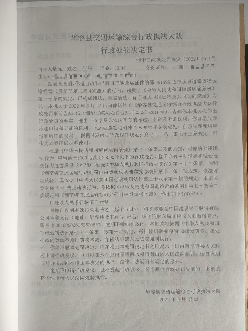 何伟擅自改装货车从事道路货物运输经营的行政处罚公示(湘华交综执处罚决定[2022]C011号)