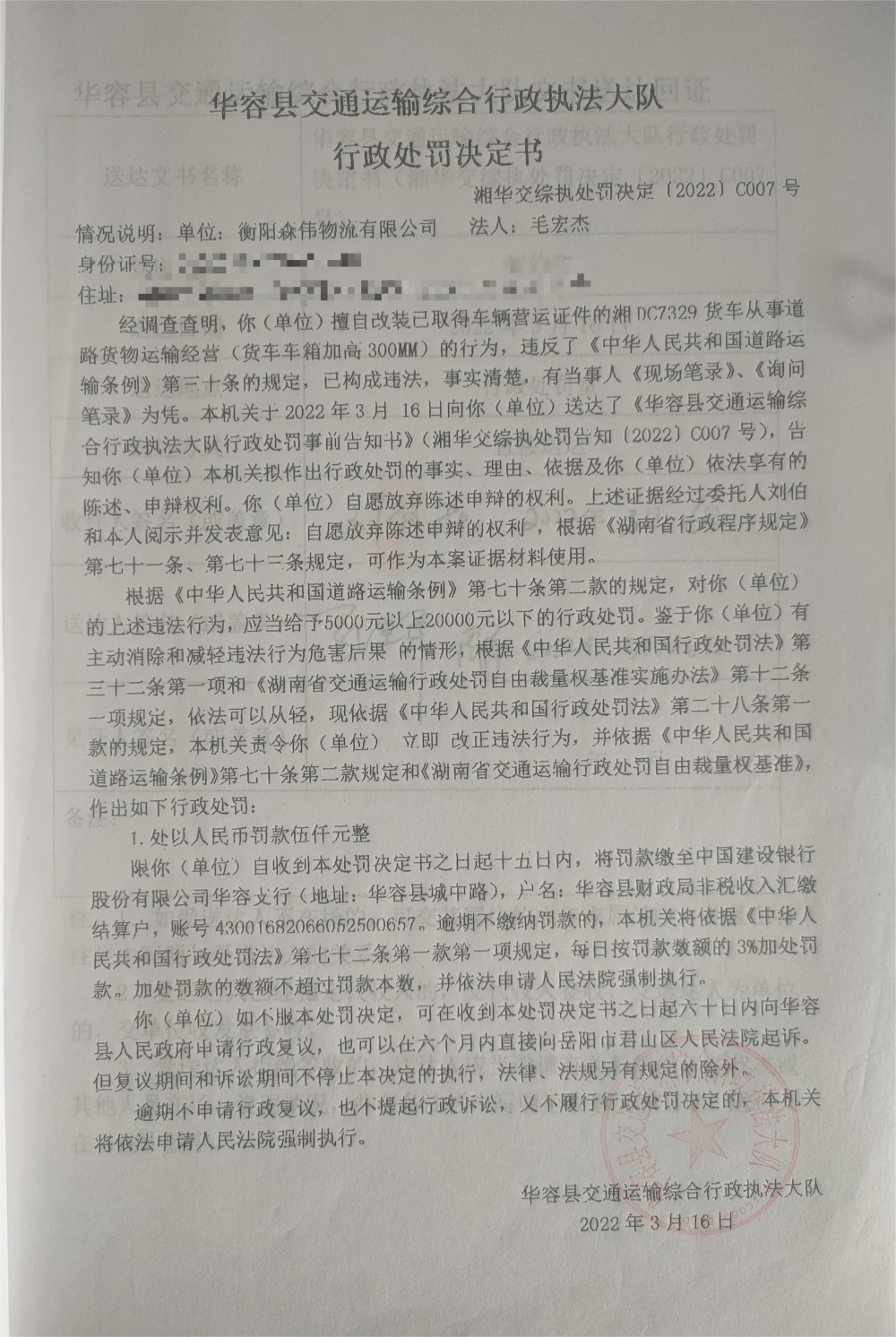 衡阳森伟物流有限公司员工擅自改装货车从事道路货物运输经营的行政处罚公示(湘华交综执处罚决定[2022]C007号)