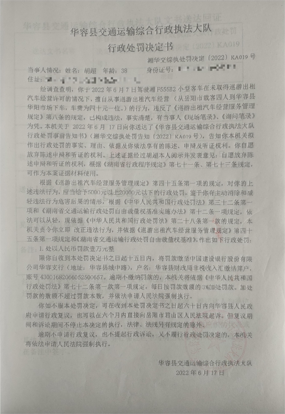 胡超擅自从事巡游出租汽车经营的行政处罚公示(湘华交综执处罚决定[2022]KA019号)