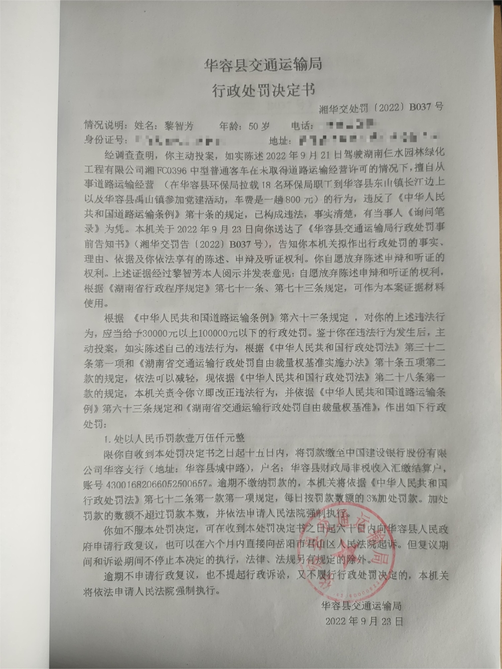 黎智芳主动投案擅自从事道路运输经营的行政处罚公示(湘华交处罚[2022]B037号)