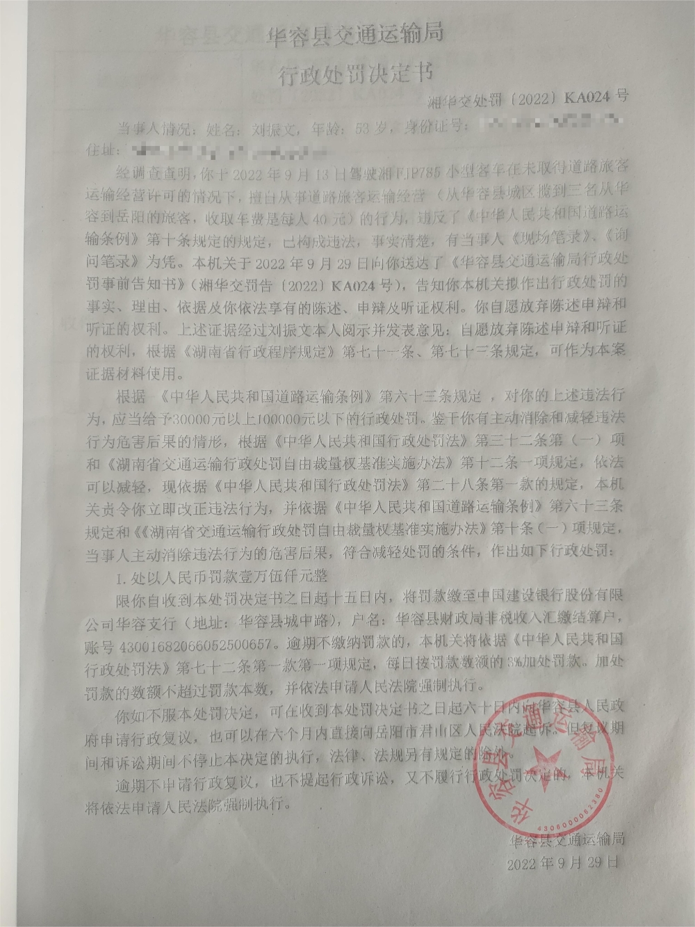 刘振文擅自从事道路旅客运输经营的行政处罚公示(湘华交综执处罚决定[2022]KA024号)