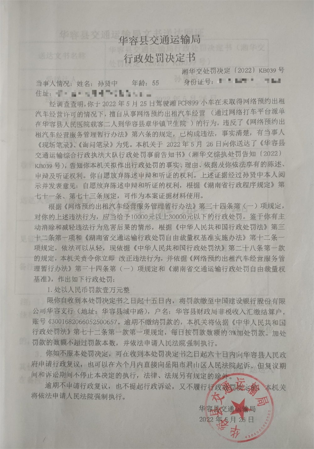 孙贤中擅自从事网络预约出租汽车经营的行政处罚公示(湘华交处罚决定[2022]KB039号)