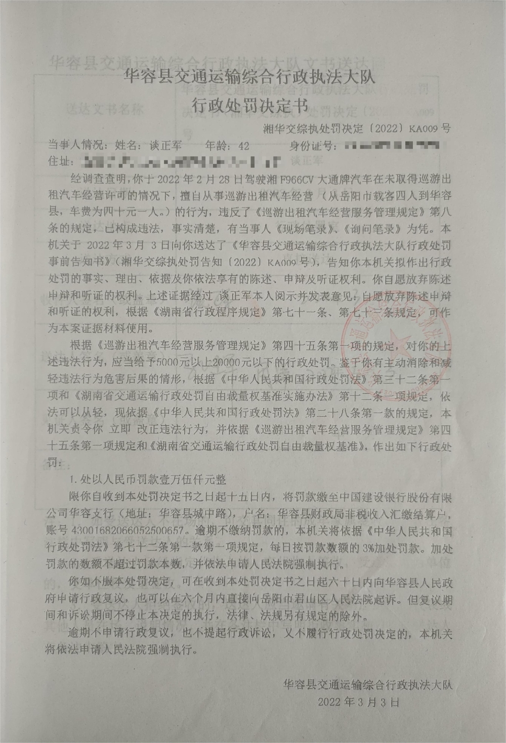 谈正军擅自从事巡游出租汽车经营的行政处罚公示(湘华交综执处罚决定[2022]KA009号)