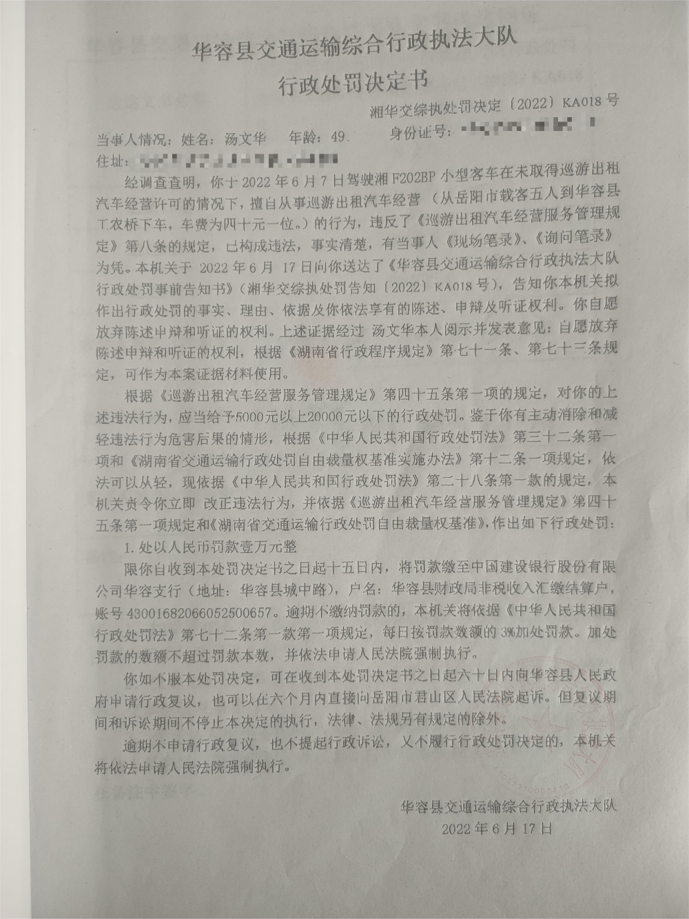 汤文华擅自从事巡游出租汽车经营的行政处罚公示(湘华交综执处罚决定[2022]KA018号)