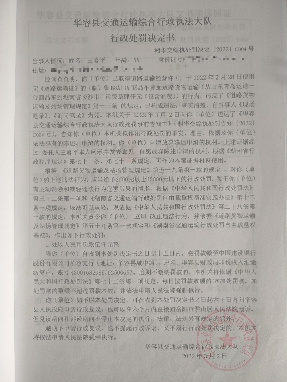 王喜平无道路运输证参加道路货物运输的行政处罚公示(湘华交综执处罚决定[2022]C004号)