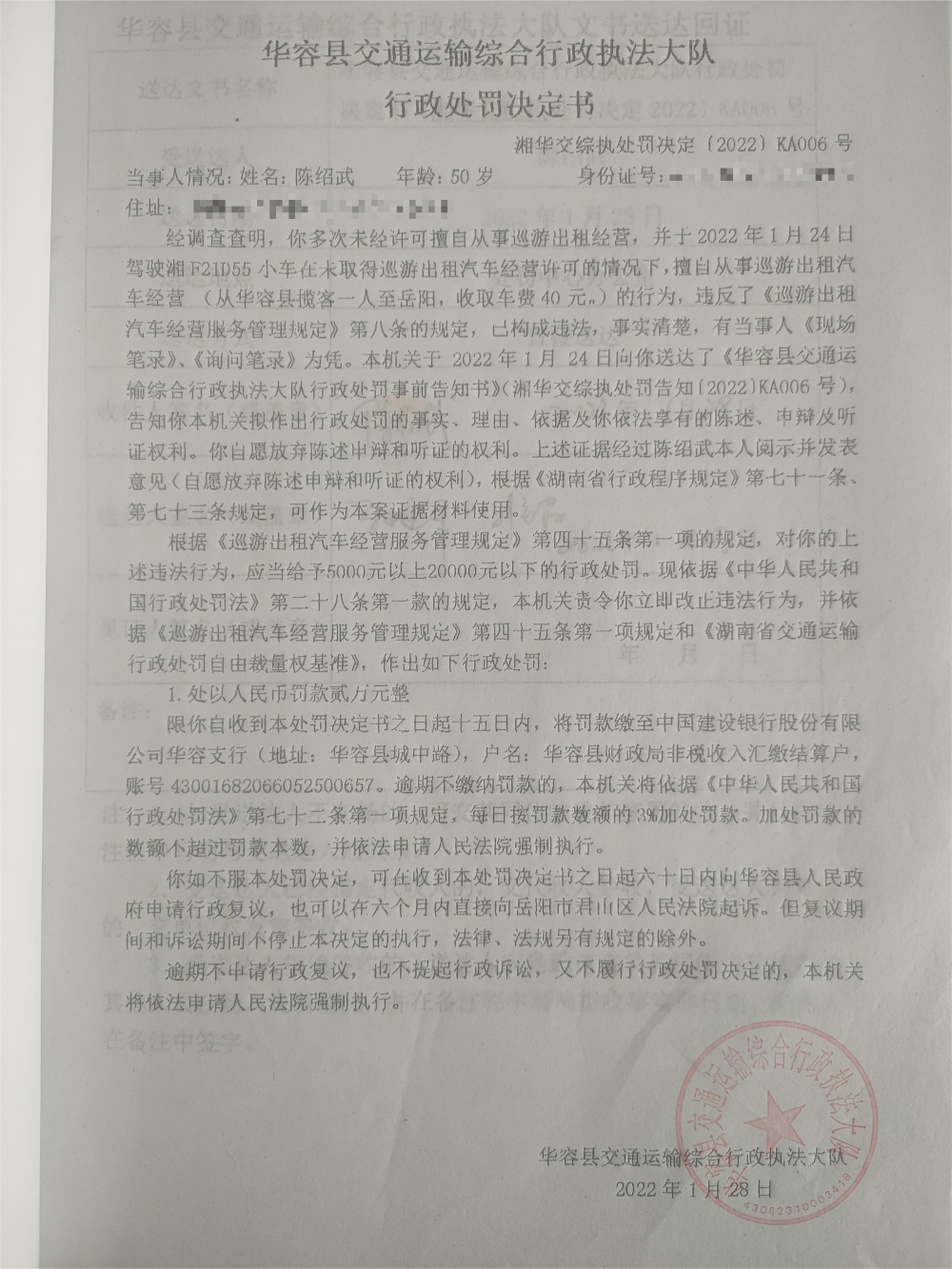 陈绍武多次未经许可擅自从事巡游出租经营的行政处罚公示(湘华交综执处罚决定[2022]KA006号)