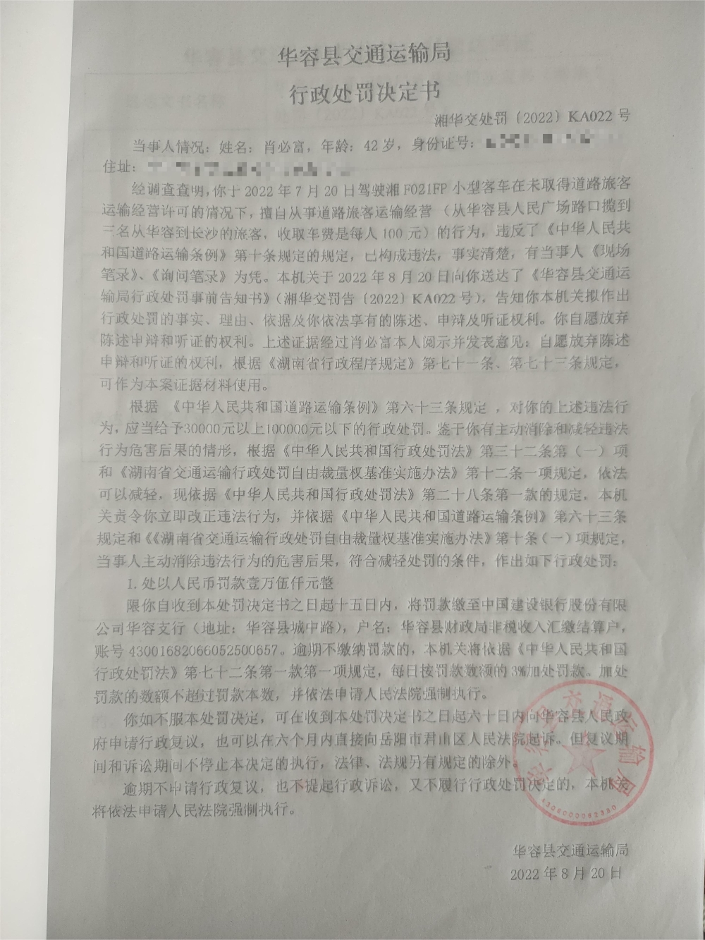 肖必富擅自从事道路旅客运输经营的行政处罚公示(湘华交处罚决定[2022]KA022号)