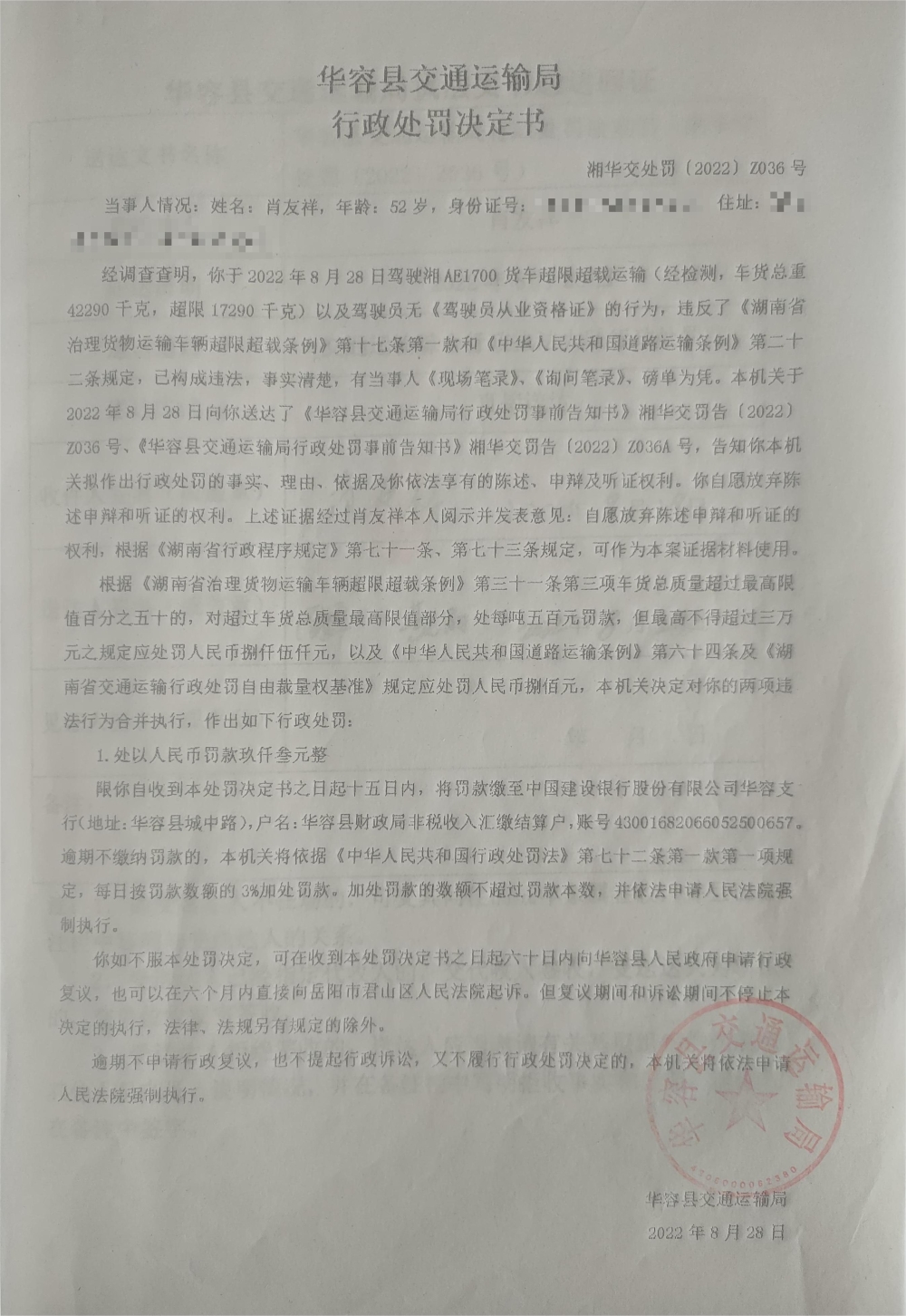 肖友祥驾驶货车超限超载运输的行政处罚公示(湘华交处罚决定[2022]Z036号)