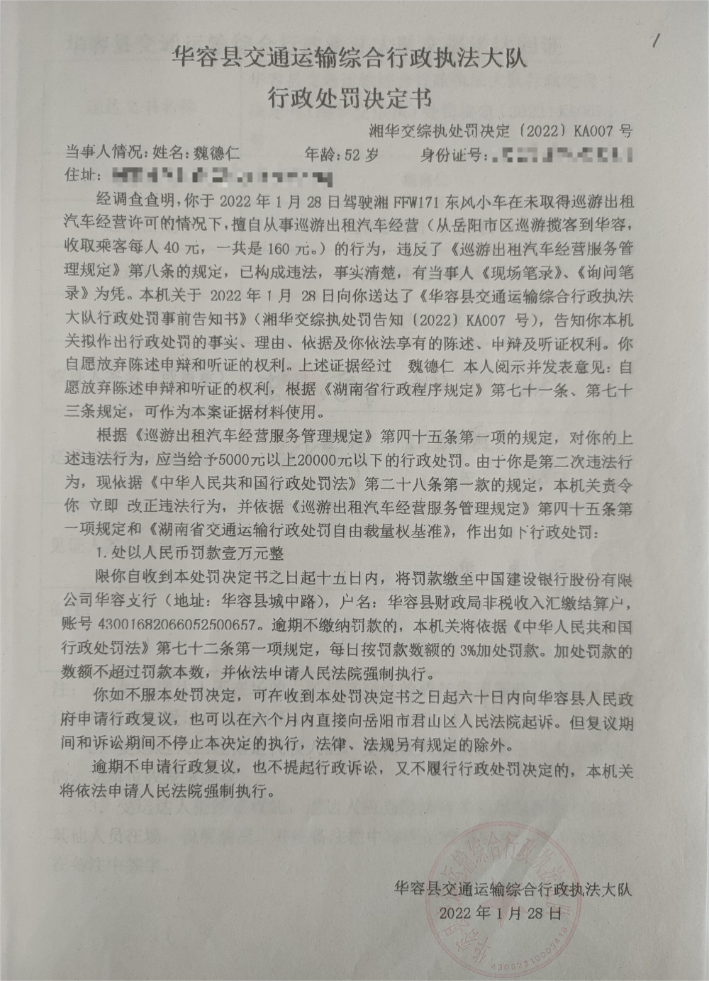 魏德仁擅自从事巡游出租汽车经营的行政处罚公示(湘华交综执处罚决定[2022]KA007号)