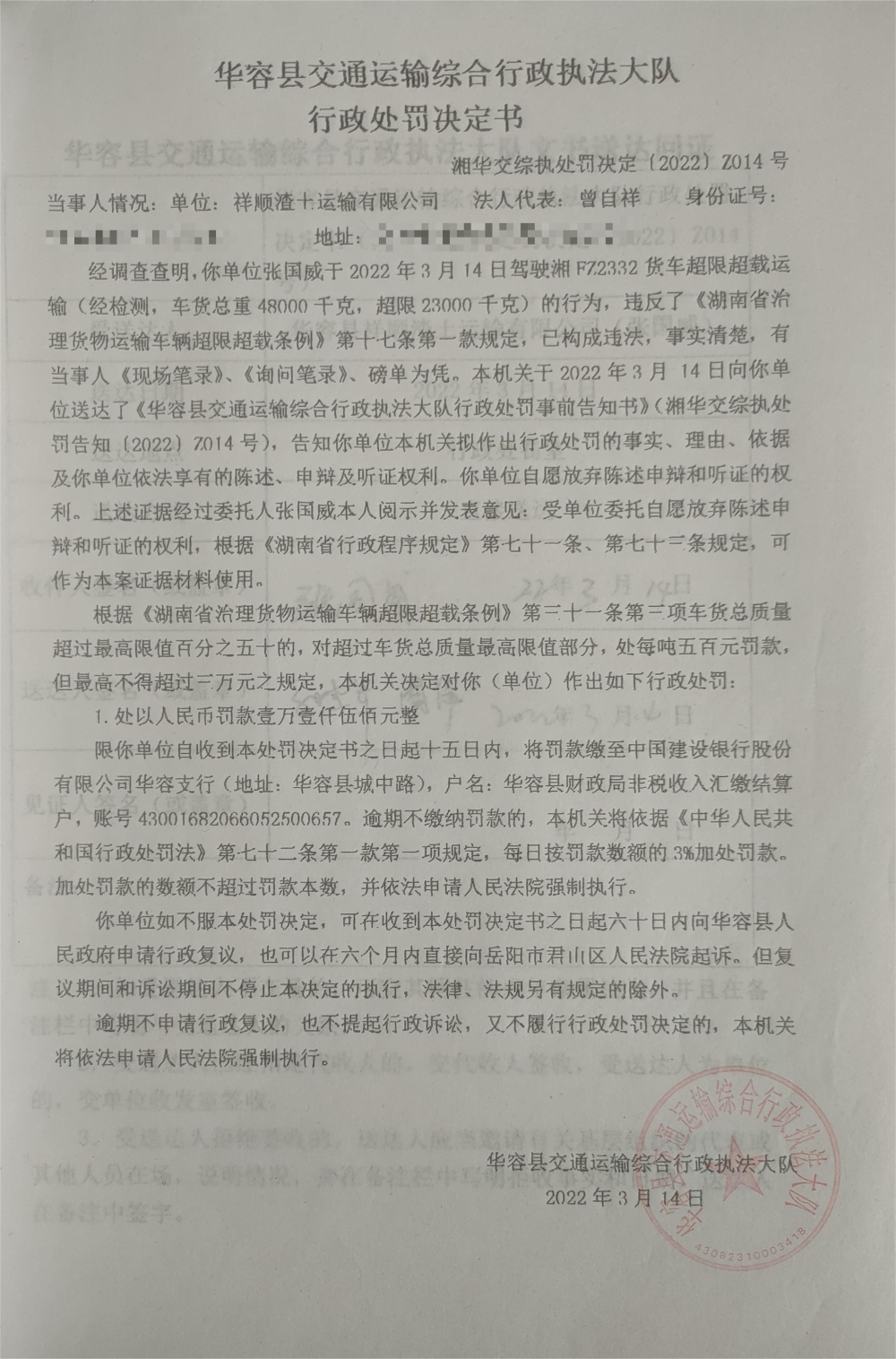 祥顺渣土运输有限公司员工驾驶货车超限超载运输的行政处罚公示(湘华交综执处罚决定[2022]Z014号)