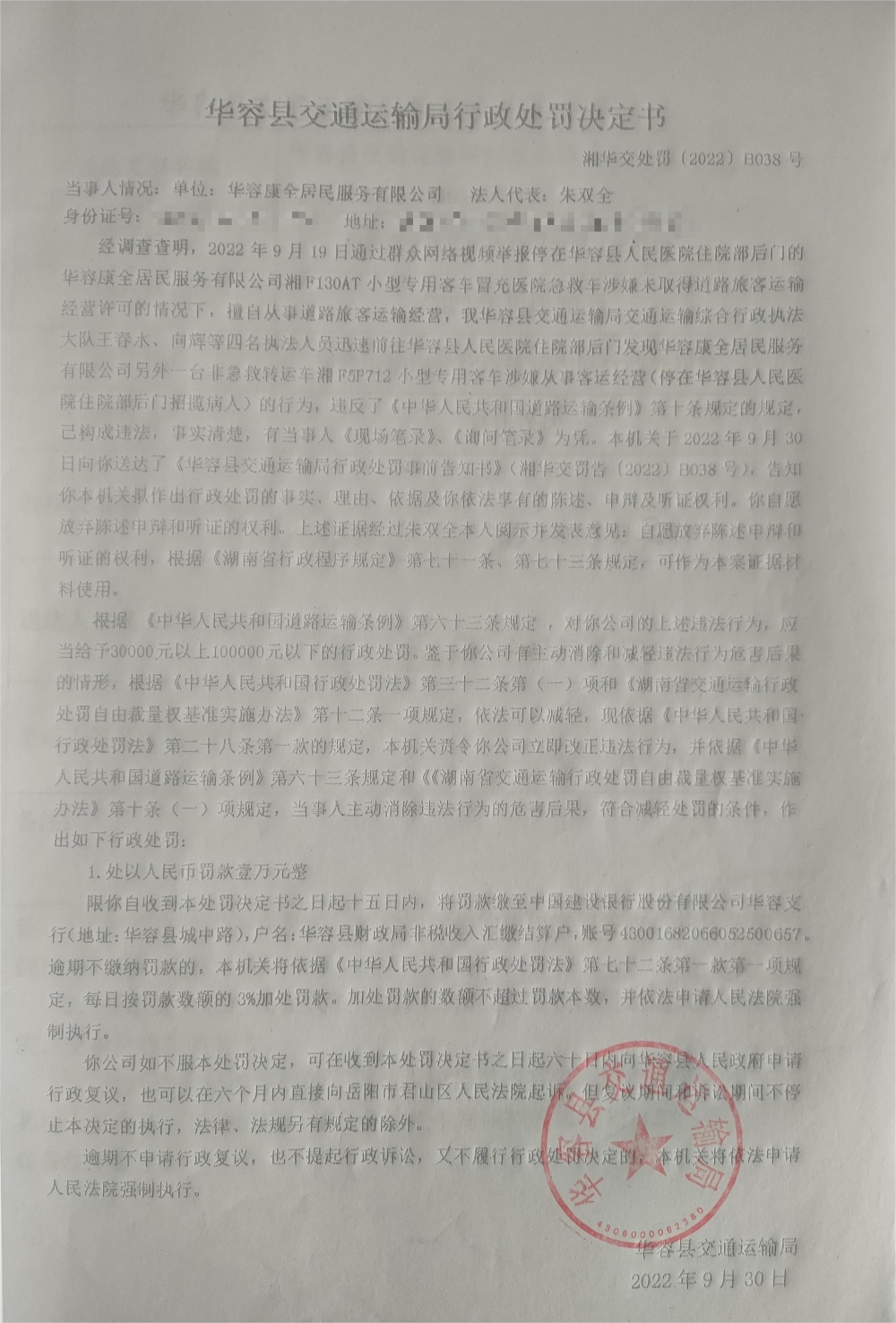 华容康全居民服务有限公司擅自从事道路旅客运输经营的行政处罚公示(湘华交处罚决定[2022]B038号)