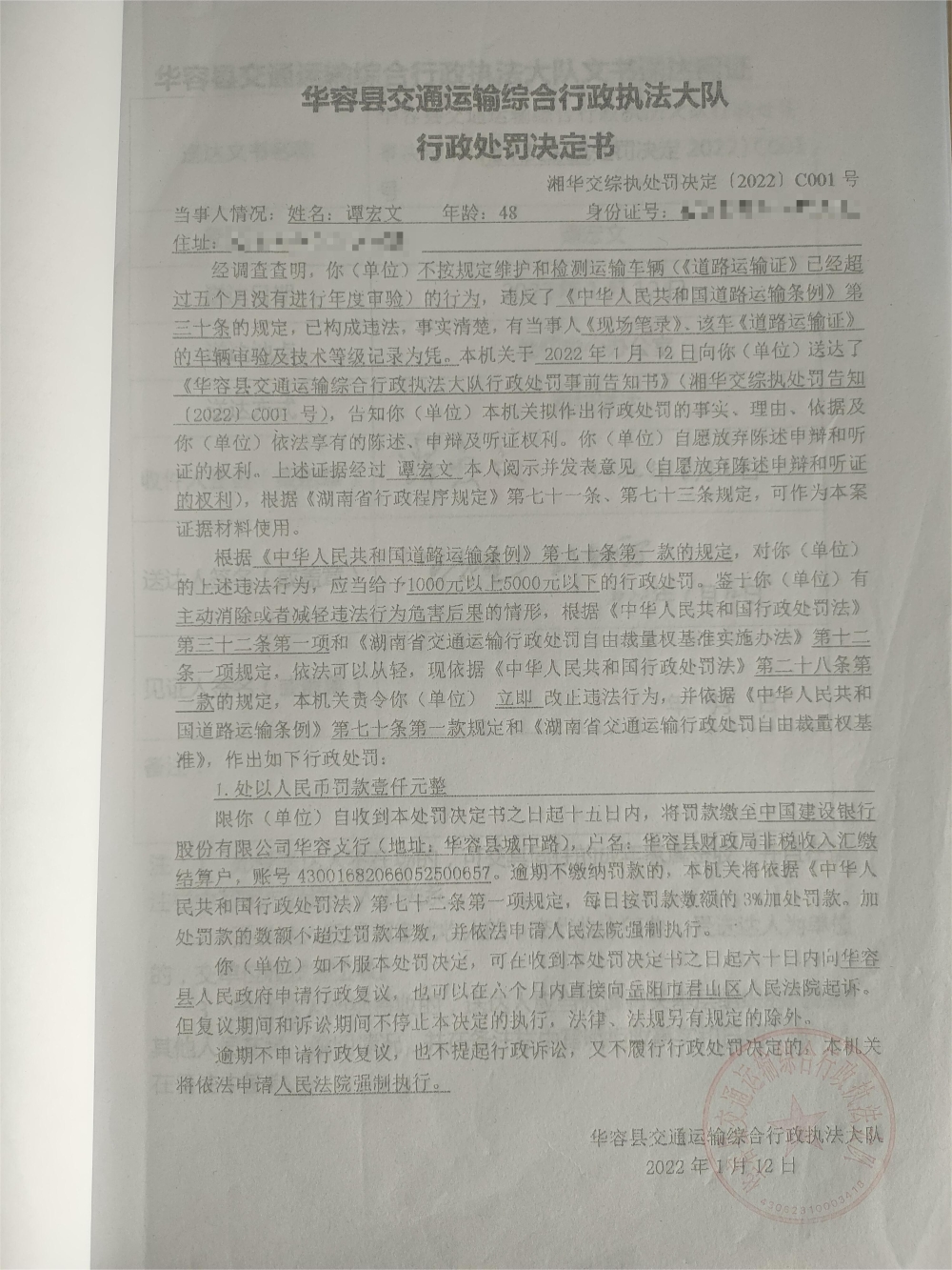 谭宏文不按规定维护和检测运输车辆的行政处罚公示(湘华交综执处罚决定[2022]C001号)