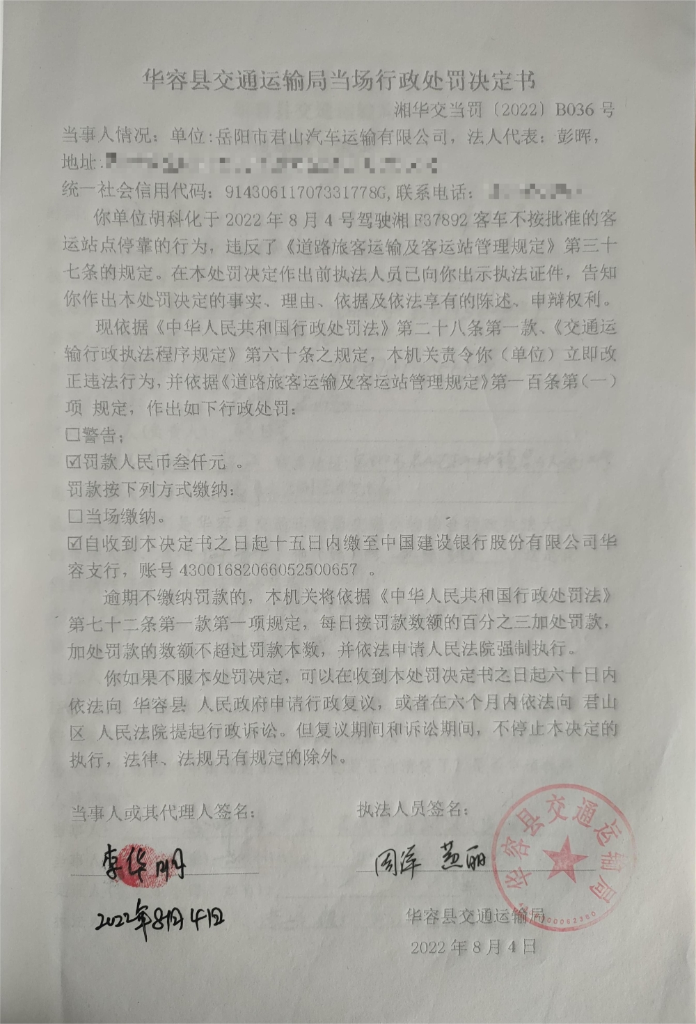 岳阳市君山汽车运输有限公司员工驾驶货车不按批准的客运站点停靠的行为的行政处罚公示(湘华交当罚[2022]B036号)