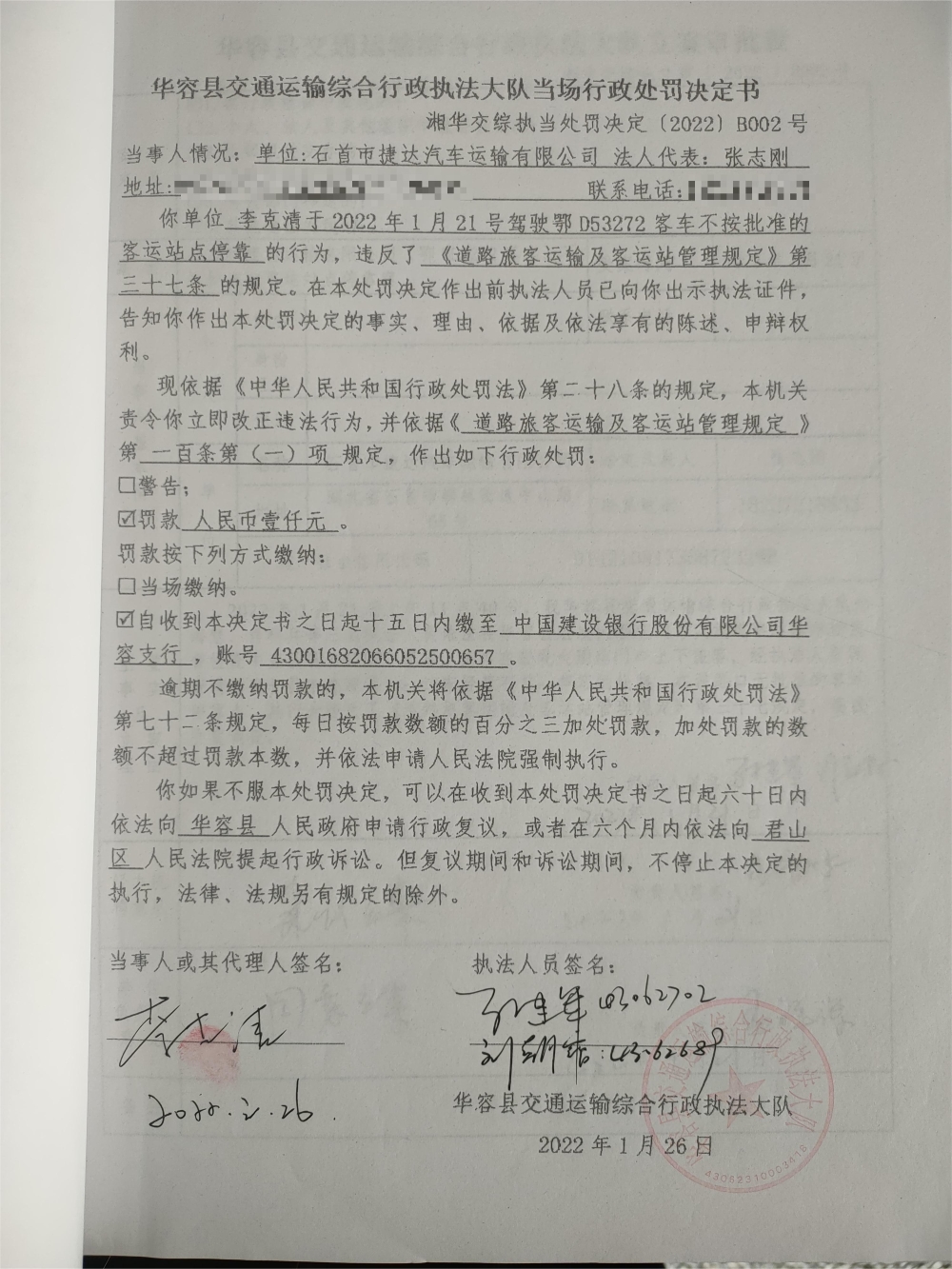 石首市捷达汽车运输有限公司员工驾驶客车不按批准的客运站点停靠的行政处罚公示(湘华交综执当处罚决定2022]B002号)