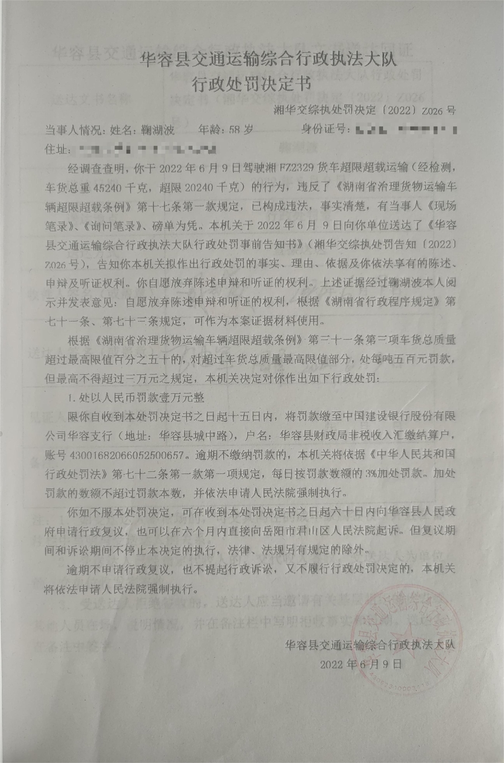 鞠湖波驾驶货车超限超载运输的行政处罚公示(湘华交综执处罚决定[2022]Z026号)