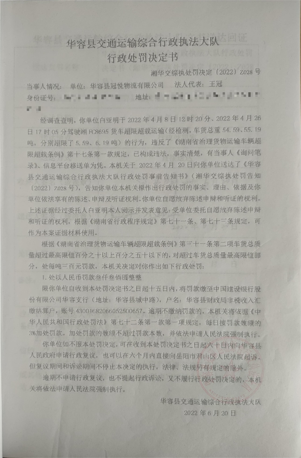 华容县冠悦物流有限公司员工驾驶货车超限超载运输的行政处罚公示(湘华交综执处罚决定[2022]Z028号)