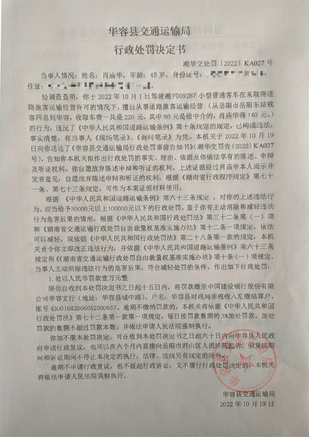肖庙华擅自从事道路旅客运输经营的行政处罚公示(湘华交处罚[2022]KA027号)