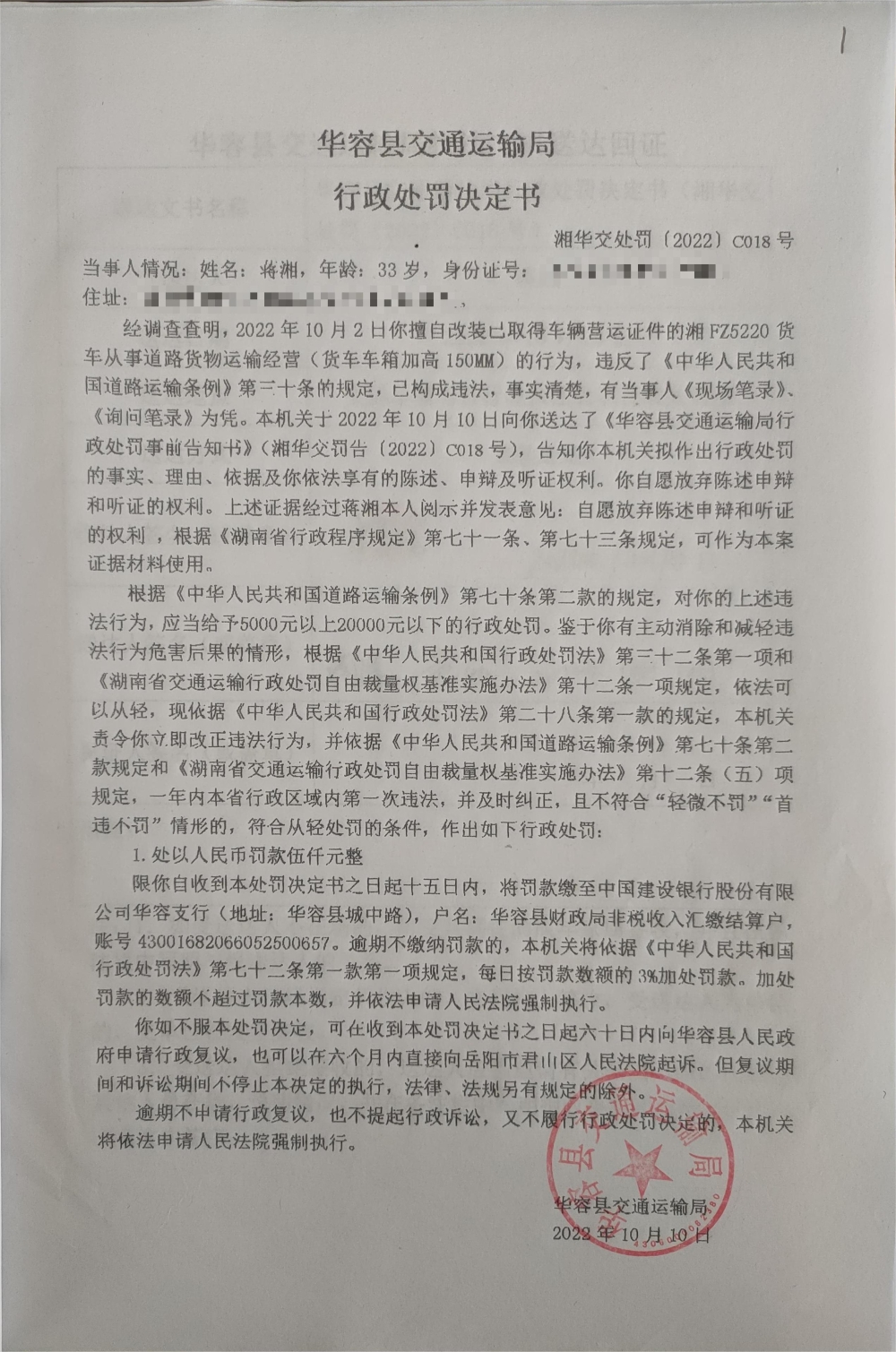 蒋湘擅自改装货车从事道路货物运输经营的行政处罚公示(湘华交处罚[2022]C018号)