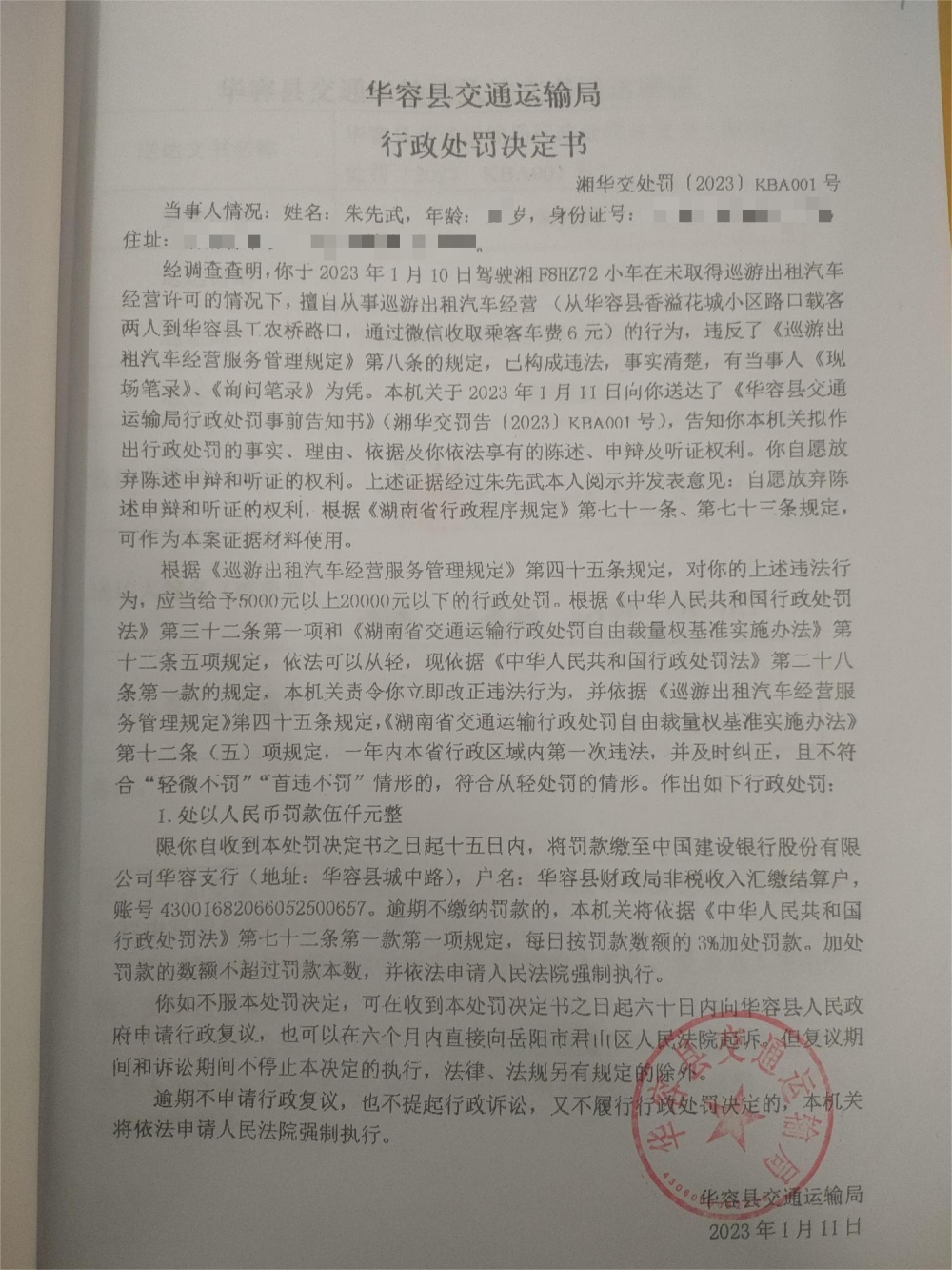 朱先武擅自从事巡游出租汽车经营的行政处罚公示(湘华交处罚[2023]KBA001号)