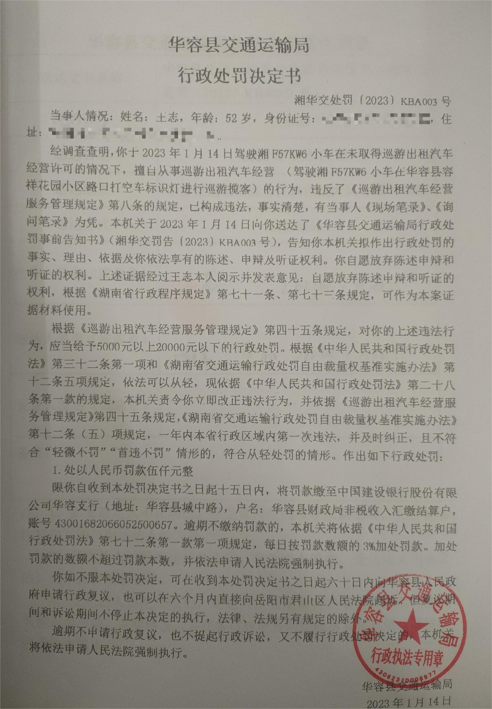 王志擅自从事巡游出租汽车经营的行政处罚公示(湘华交处罚[2023]KBA003号)