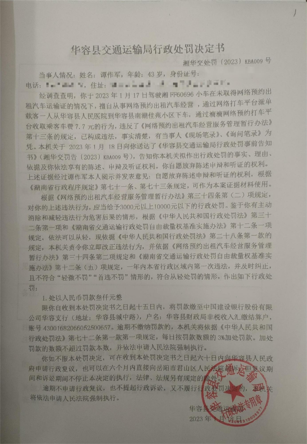 谭作军擅自从事网络预约出租汽车经营的行政处罚公示(湘华交处罚[2022]KBA009号)